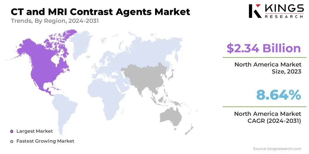 North America accounted for 39.17% share of the CT and MRI contrast agents market in 2023, with a valuation of USD 2.34 billion. The dominance of North America can be attributed to several factors, including the high prevalence of chronic diseases such as cancer, cardiovascular disorders, and neurological conditions, which drive the demand for advanced imaging solutions.