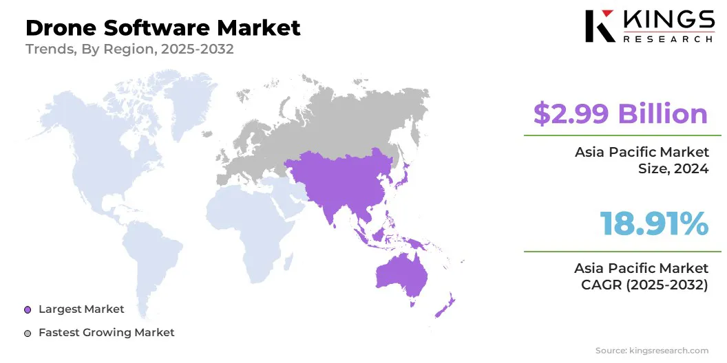 Rising investments in drone technology across China, Japan, India, and South Korea fuel strong demand for advanced drone software solutions. The region benefits from increasing adoption of drones for agriculture, infrastructure, logistics, and surveillance applications, led by government initiatives promoting innovation and smart city development.