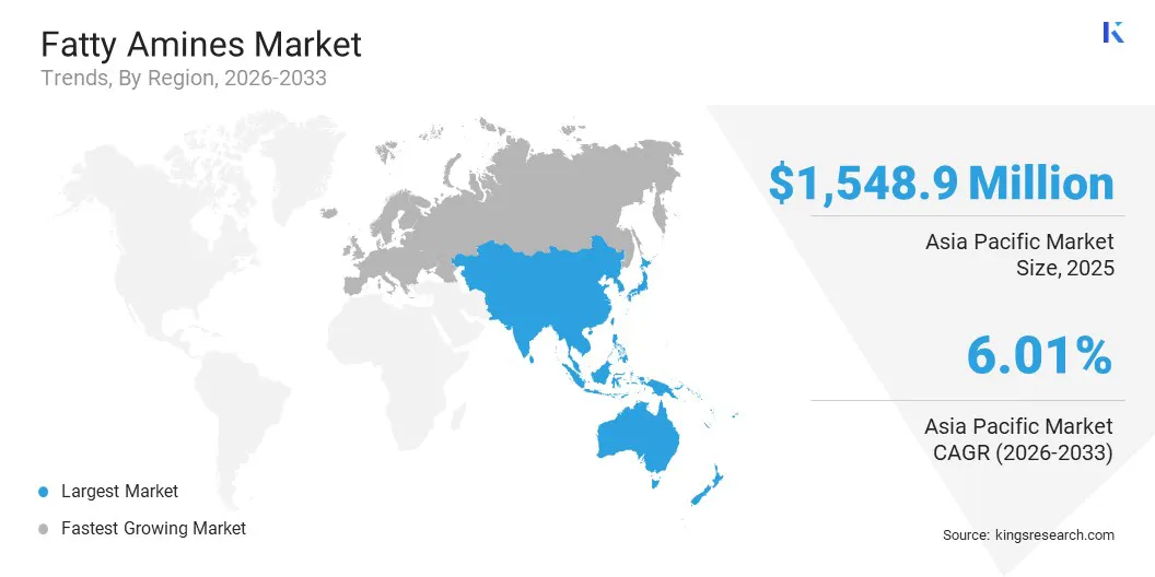 A Ásia-Pacífico é responsável pela quota de mercado dominante, aproximando-se de 37,40% em 2025. A elevada quota é atribuível à presença de um sector industrial relativamente maior, à rápida urbanização e ao aumento da procura de agroquímicos, cuidados pessoais e instalações de tratamento de água. O forte crescimento da actividade agrícola nas principais economias asiáticas, incluindo a China, a Índia e o Sudeste Asiático, impulsiona ainda mais a procura de aminas gordas, devido ao seu consumo generalizado como emulsionantes e agentes molhantes em formulações agroquímicas.
