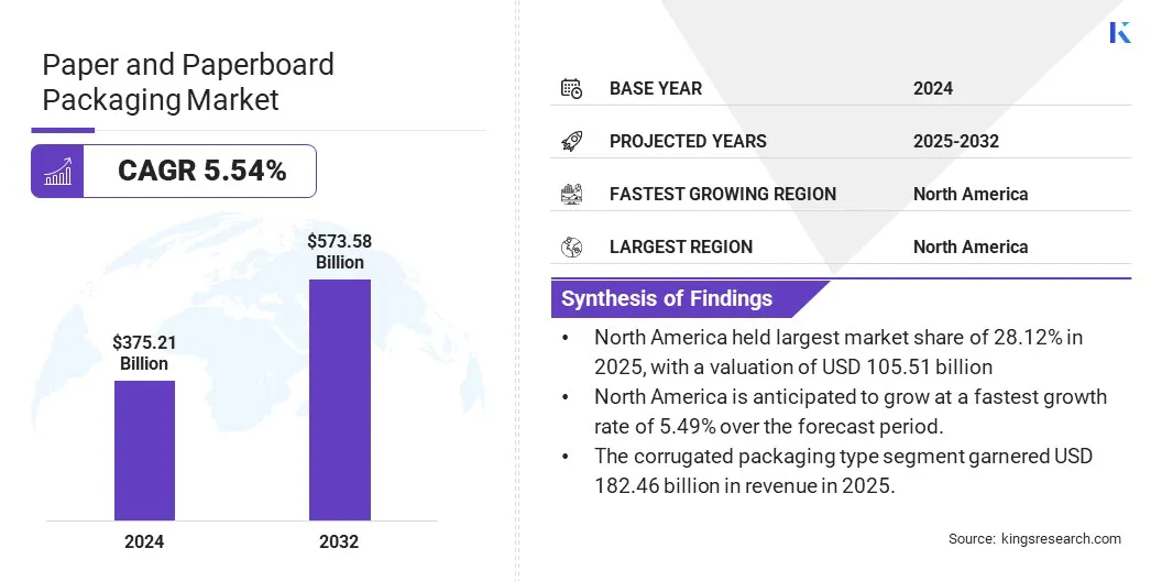 O tamanho global do mercado de embalagens de papel e papelão foi avaliado em US$ 375,21 bilhões em 2025 e deve crescer de US$ 393,26 bilhões em 2026 para US$ 573,58 bilhões até 2032, exibindo um CAGR de 5,54% durante o período de previsão (2026-2033).