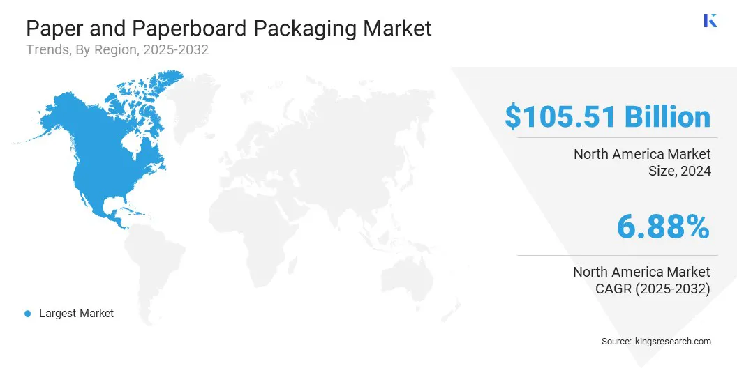 A participação de mercado de embalagens de papel e cartão da América do Norte ficou em 28,12% em 2025 e deverá crescer a um CAGR de 6,88% durante o período de previsão. Este crescimento é impulsionado principalmente pela forte demanda por soluções de embalagens sustentáveis nos setores de alimentos e bebidas, comércio eletrônico, varejo e bens de consumo.